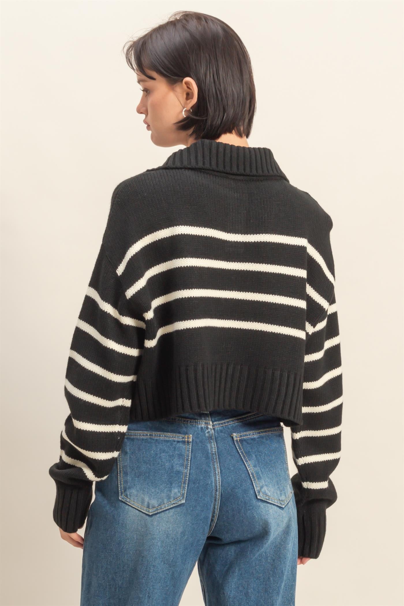 Styling this cute sweater will become your favorite thing. It comes with a striped pattern all over, ensuring a trendy look. The exaggerated collar leads to long sleeves and an oversized bodice with a crop hem. Ribbed knit accents the sleeves and hem.