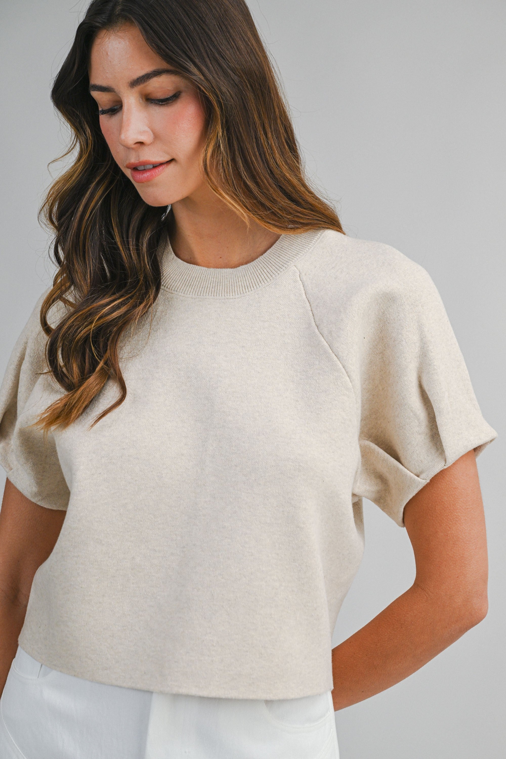 Short sleeve knit sweater top featuring a clean crew neckline and relaxed silhouette with gathered sleeves.