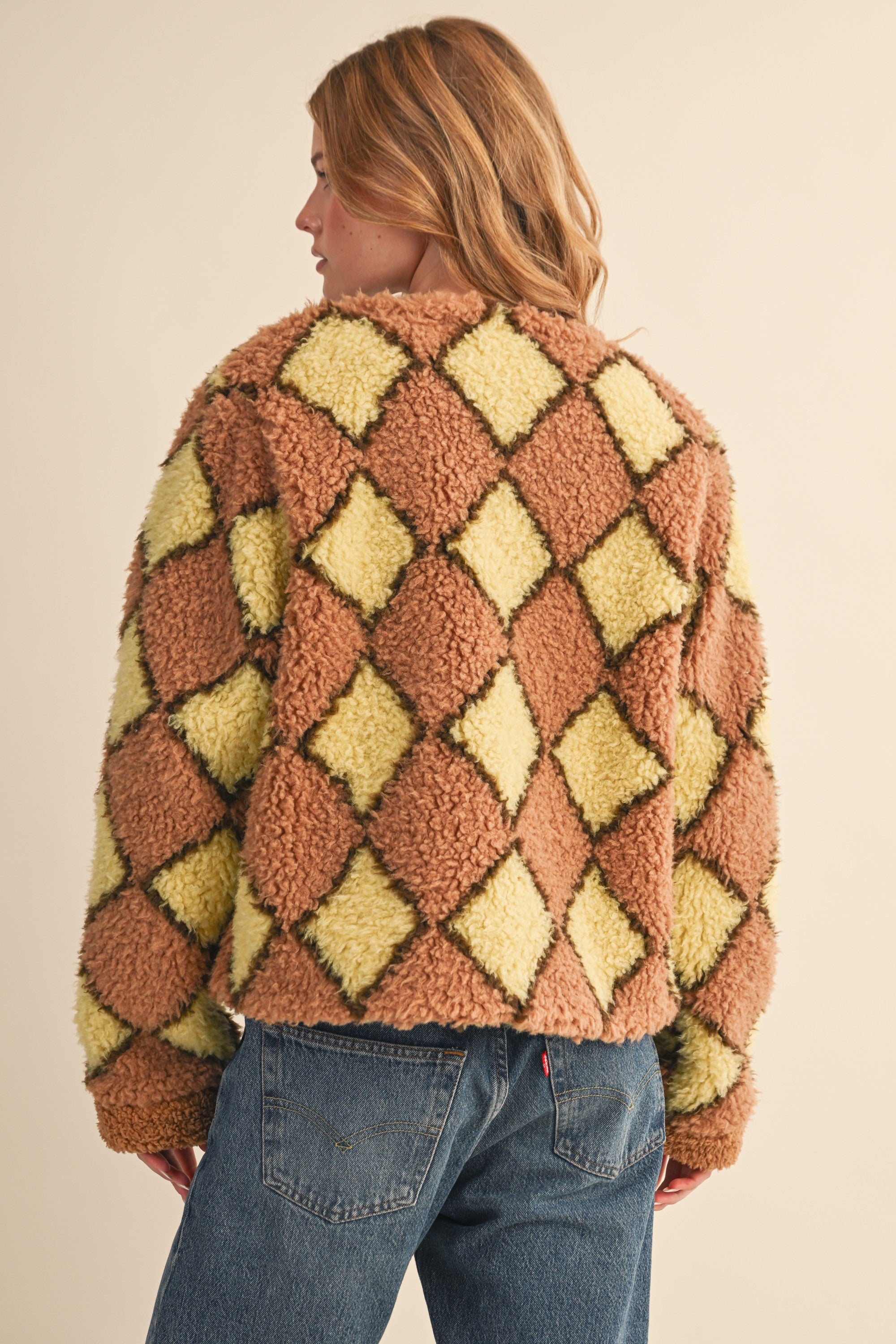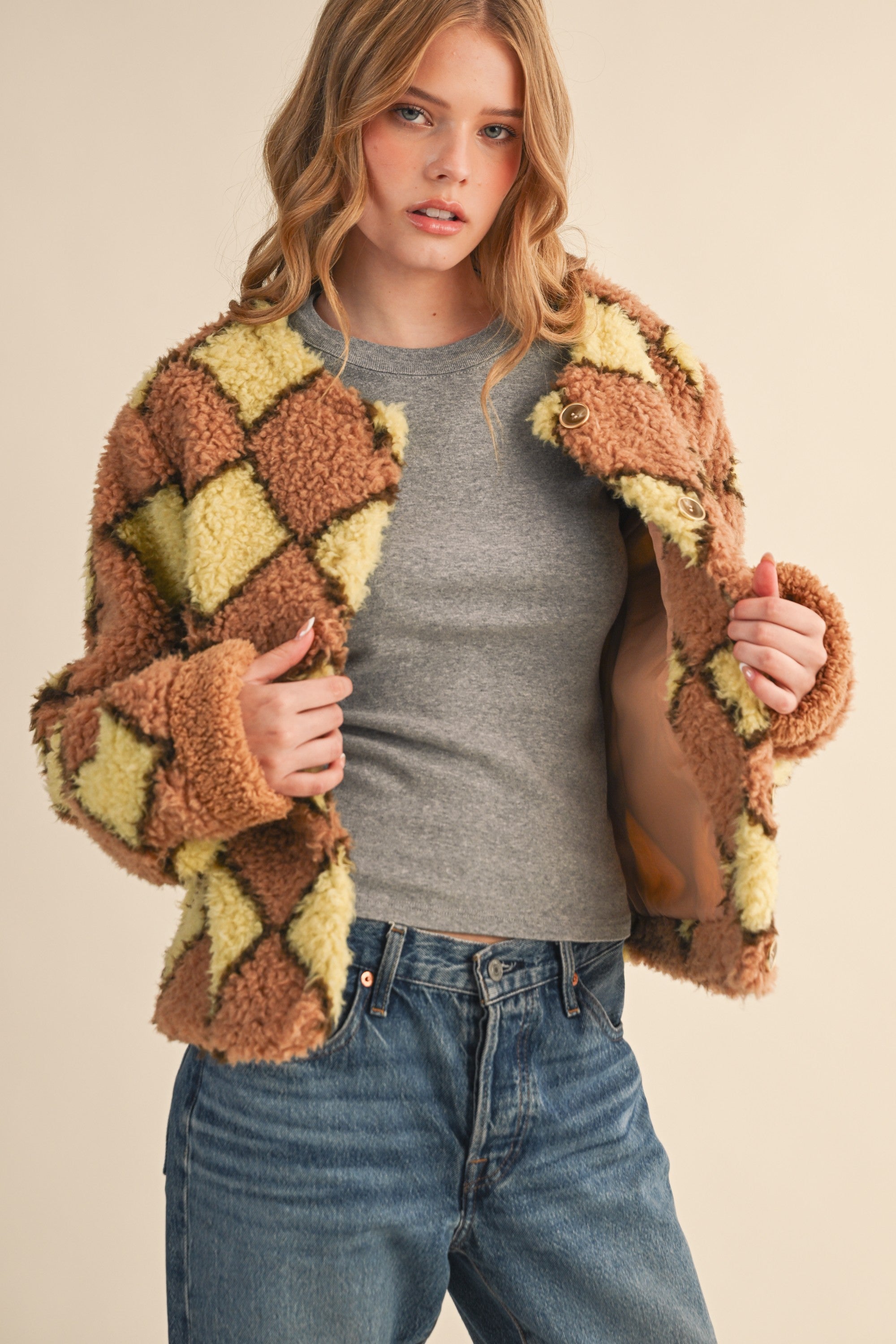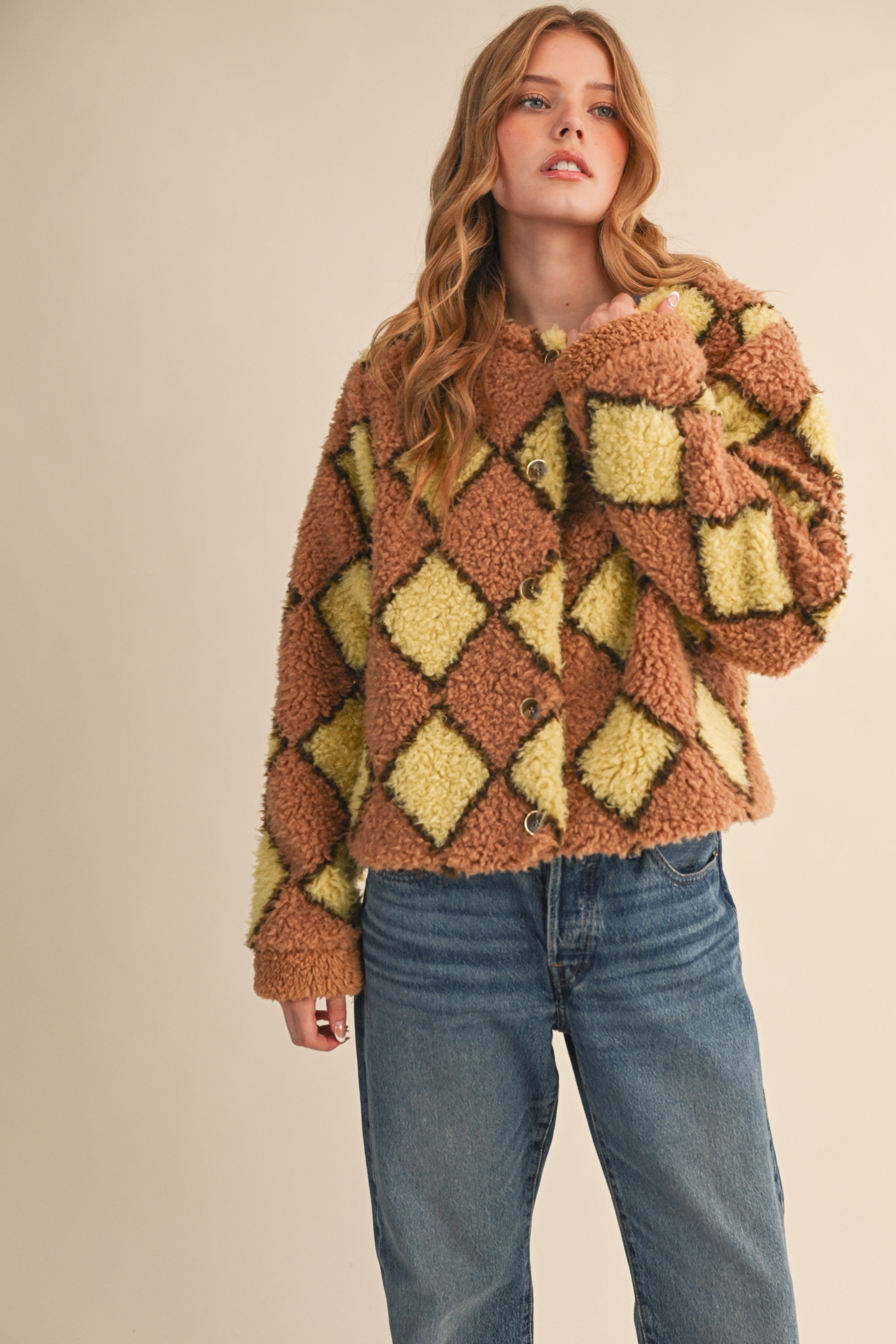 The One & Only Jacket combines cozy faux shearling with timeless argyle styling for effortless sophistication. Featuring a classic round neckline and convenient button front, this piece layers beautifully over any outfit. Decorative gold trim buttons add a touch of polish and elevate the overall look. Perfect for staying warm while maintaining your signature style.