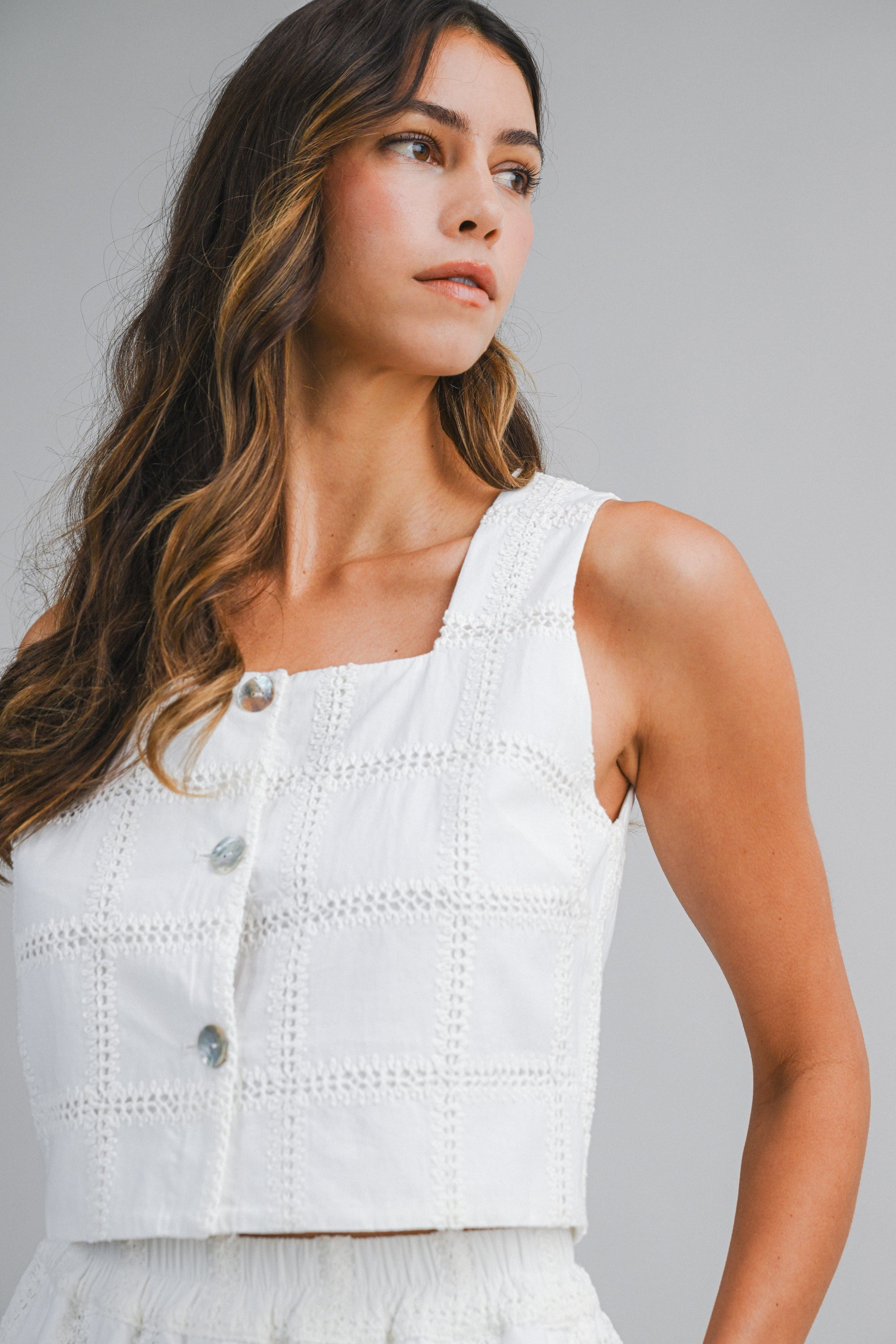 Two-piece cotton set featuring a sleeveless button-front cropped top with a square neckline. Designed with an allover eyelet pattern.