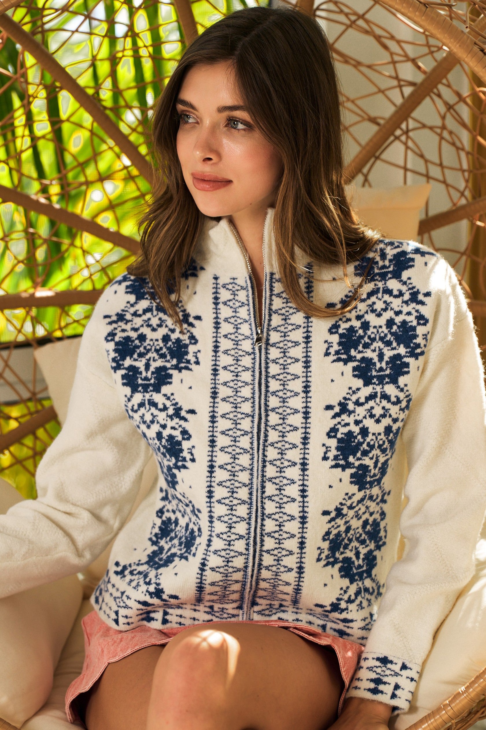 The Ski Lodge Sweater is a charming cardigan featuring delicate floral embroidery that adds a touch of elegance. The open zip front makes it easy to layer and adjust to your comfort level. Soft and inviting, this piece transitions seamlessly from cozy nights in to casual outings.