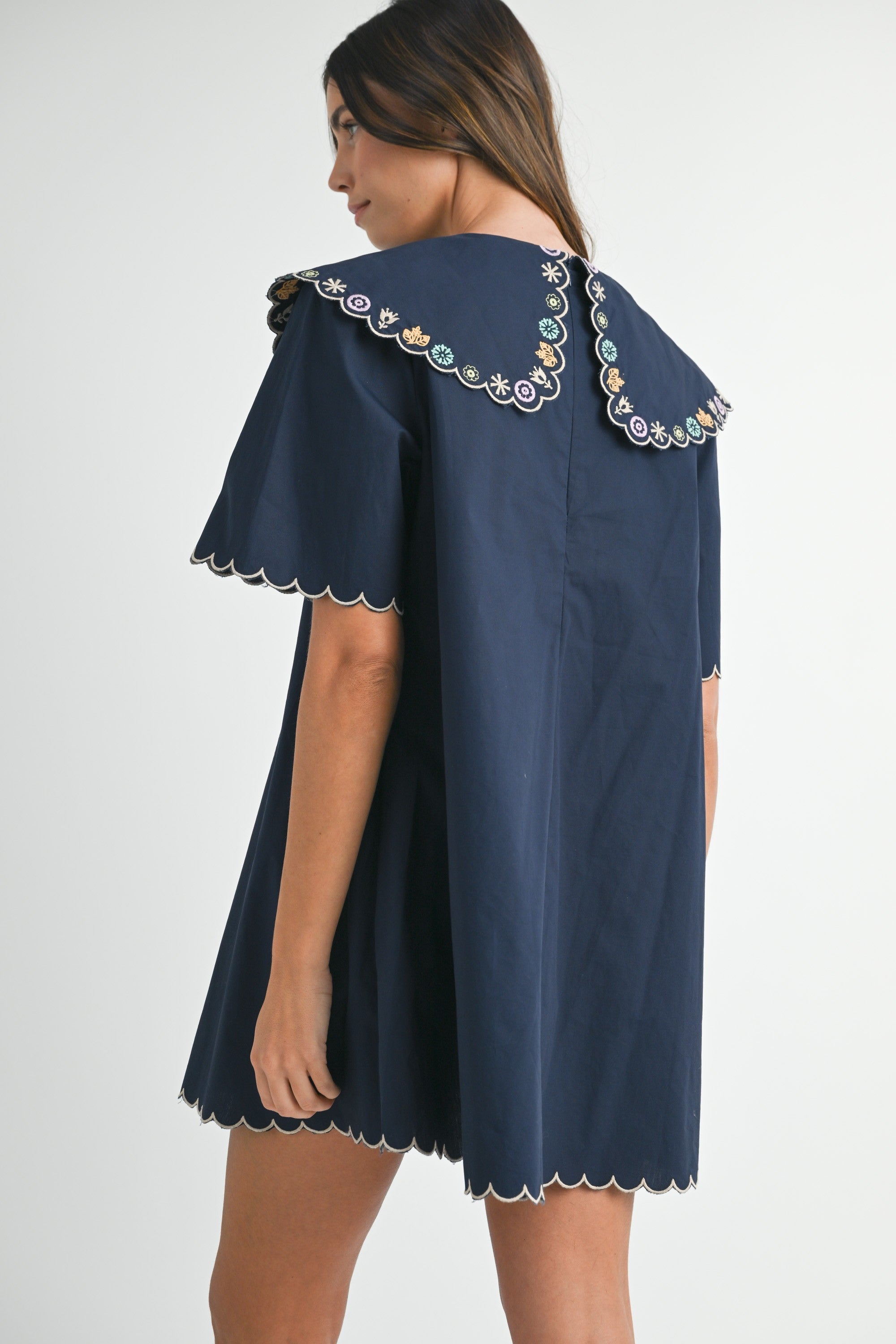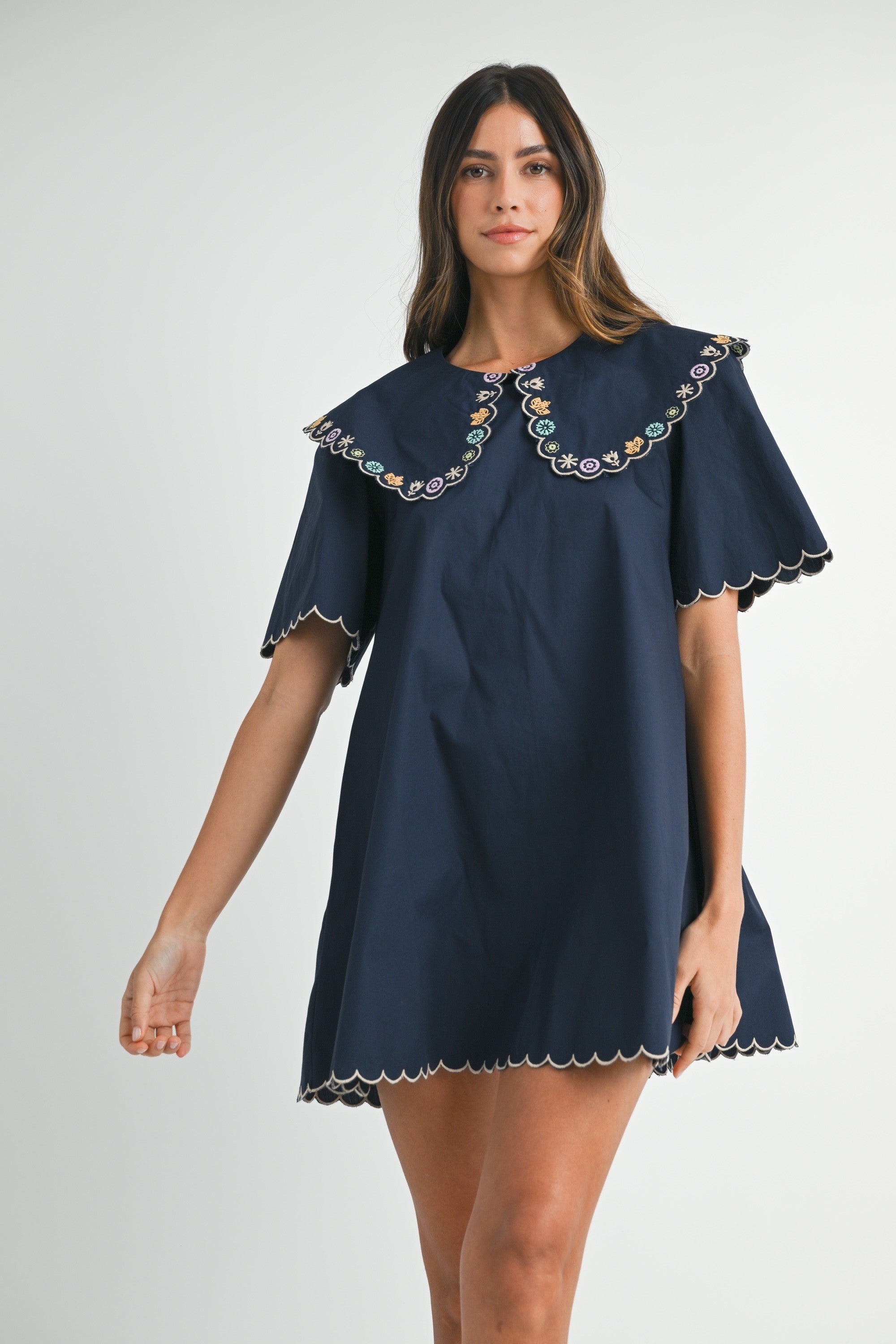 Solid short sleeve ruffle detail embroidery peter pan collar mini dress with side pocket and scallop detail.