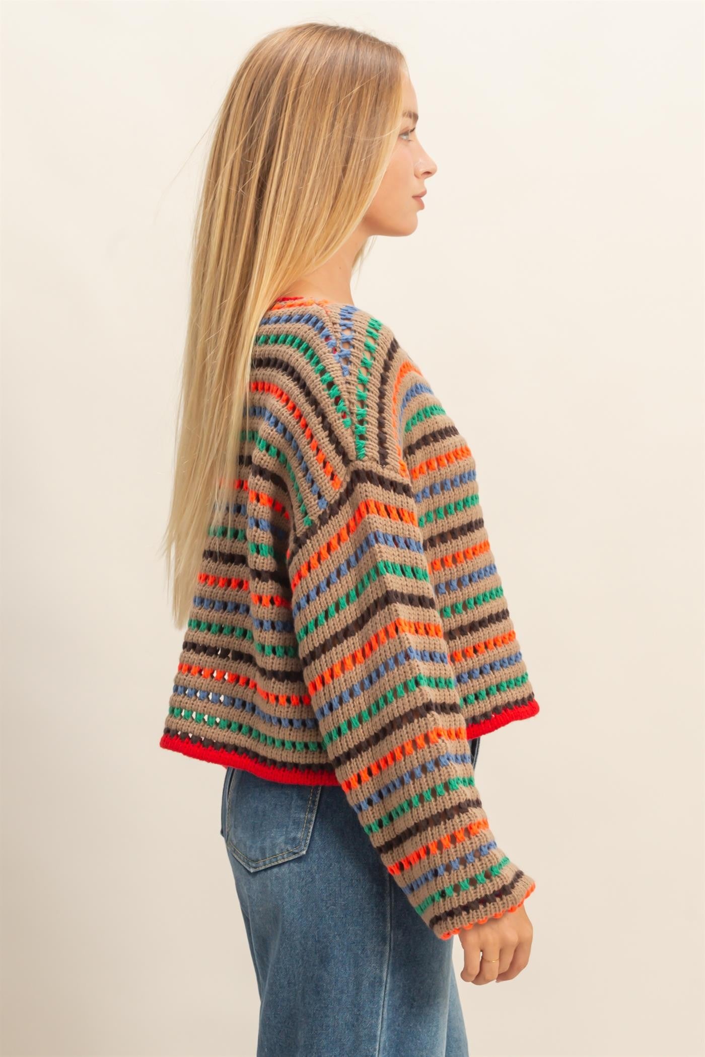 The Amber Sweater brings effortless style with its bold multi-color stripe pattern and relaxed oversized fit. Perfect for layering or wearing solo, this cozy piece works with everything from jeans to skirts. The comfortable silhouette flatters all body types while the vibrant stripes add visual interest to any outfit. A versatile wardrobe essential that feels as good as it looks.