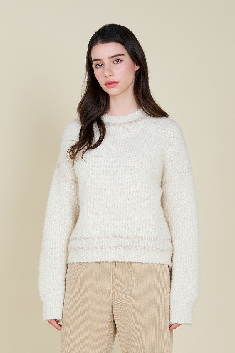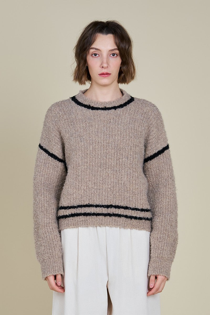 Cropped round neck sweater with a striking contrast stripe detail that adds visual interest. The shorter length pairs perfectly with high-waisted bottoms for a flattering silhouette. Simple yet stylish, this sweater brings an easy update to your everyday basics.