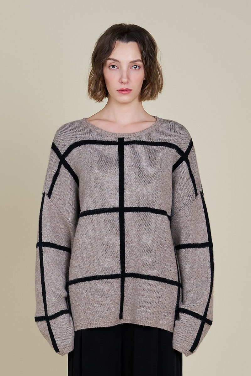 Oversized sweater with a geometric grid print that makes a modern statement. The relaxed fit provides comfort and ease while the bold pattern adds visual impact. Perfect for layering or wearing loose, this sweater brings contemporary style to your wardrobe.