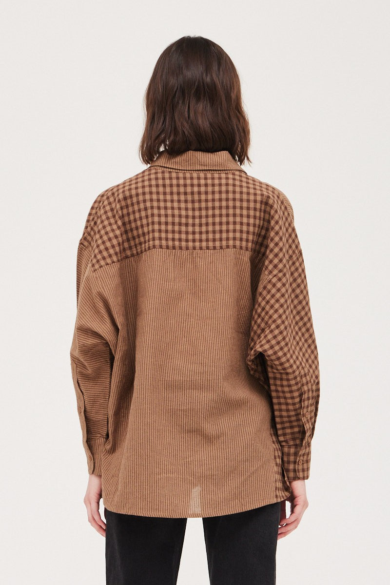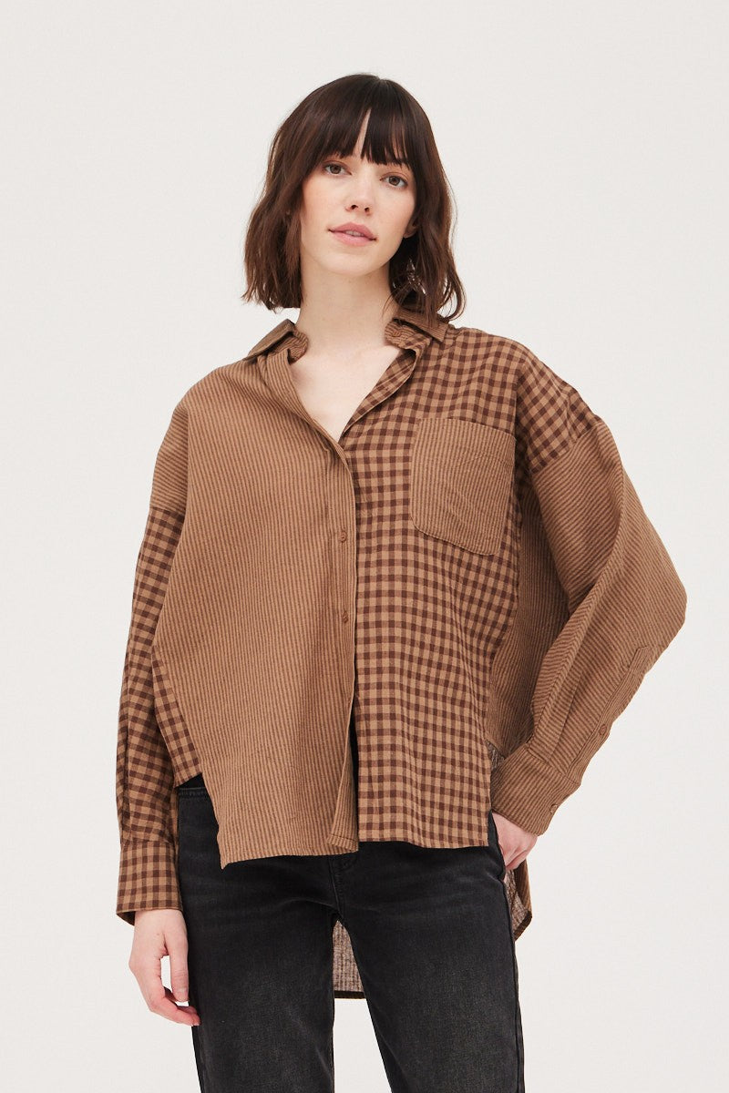 A timeless gingham shirt with a button front design that blends classic style with modern mixed media details. Perfect for layering or wearing solo, this versatile piece works for casual days or dressed-up occasions. The crisp gingham pattern adds visual interest while the quality construction ensures lasting wear.