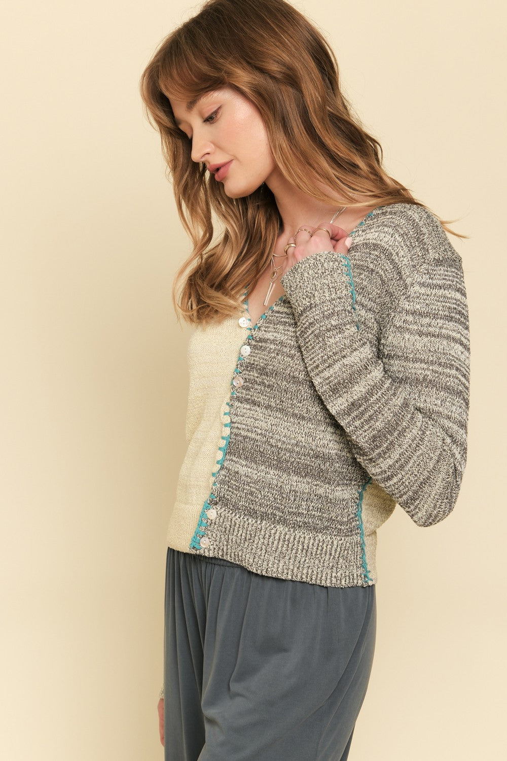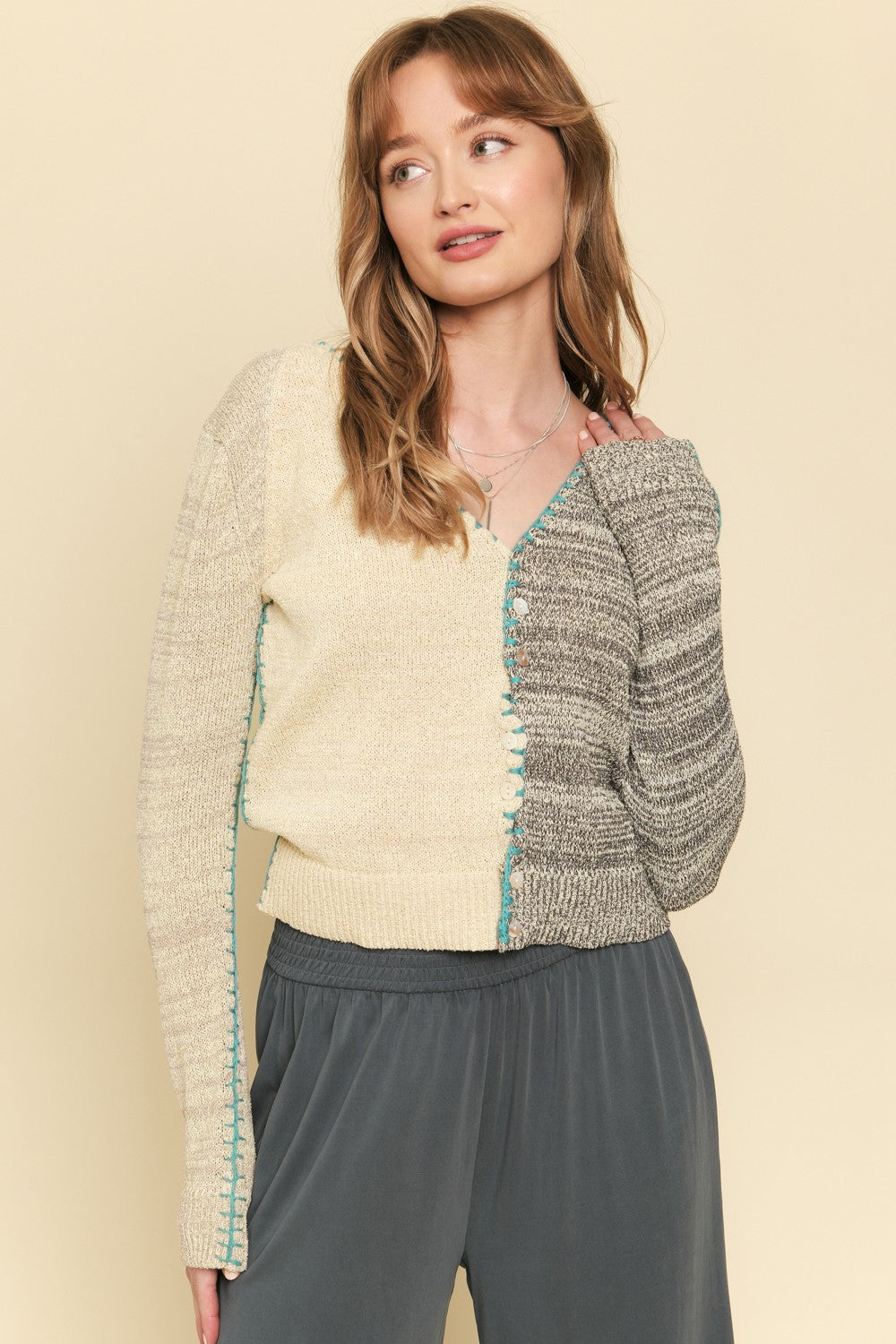 The A Little Blue Sweater is a classic button-up cardigan with color-blocked styling that adds visual interest to any outfit. Featuring a comfortable v-neck, ribbed knit fabric, and contrast stitching details, this piece layers easily over your favorite tops. A versatile wardrobe essential that works for any season.