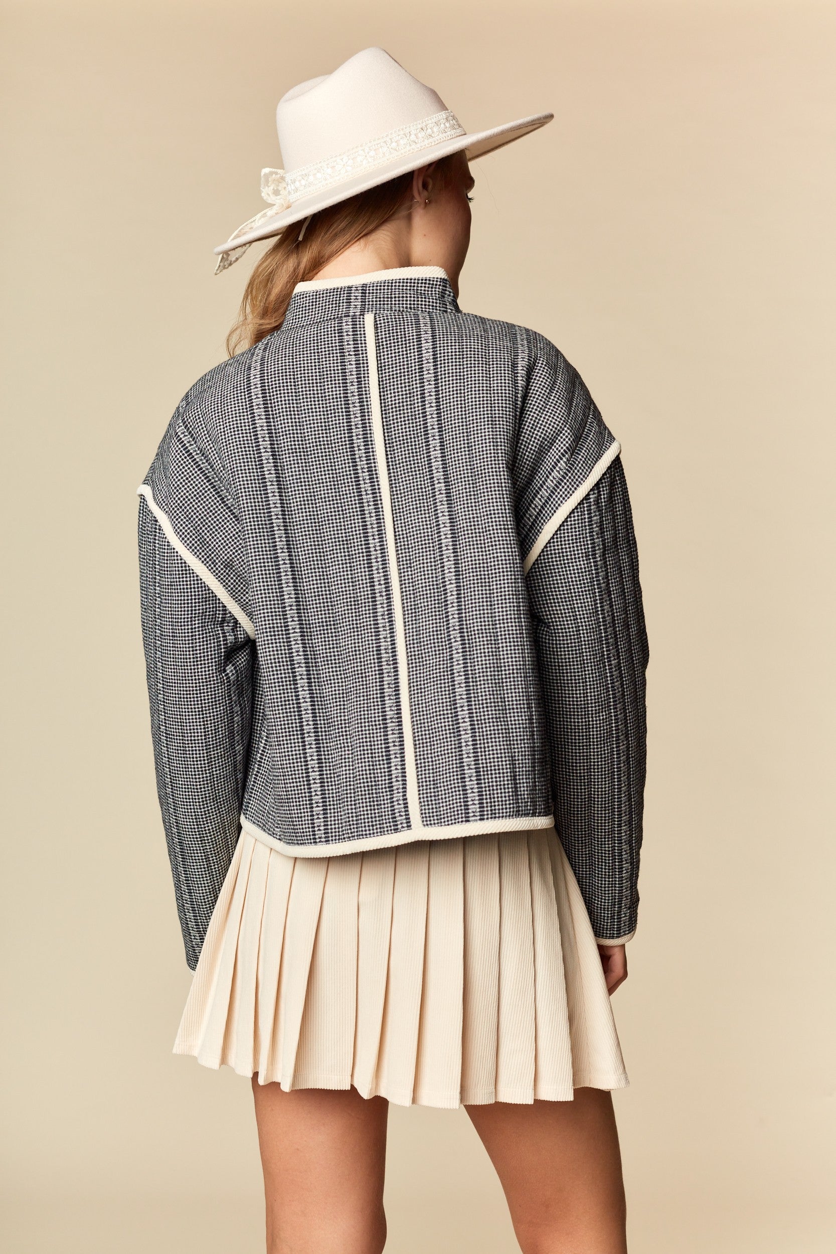 A charming quilted jacket featuring a sweet heart pocket detail and classic gingham pattern. Perfect for layering on cool days, this piece adds a playful touch to any outfit. The lightweight quilting provides warmth without bulk, while the gingham print brings timeless style. Ideal for casual wear or dressing up your everyday look.